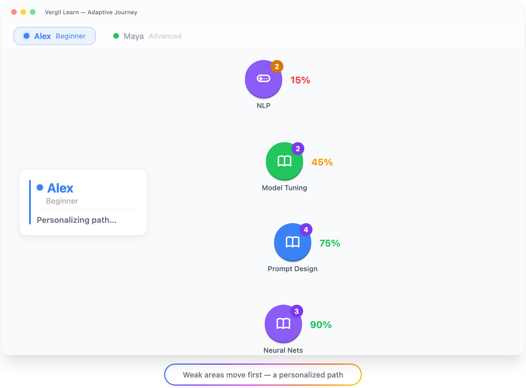 Once your knowledge graph is built, Vergil guides each learner along a personalized path — delivering content in the right order, at the right pace, and reinforcing it through targeted practice.